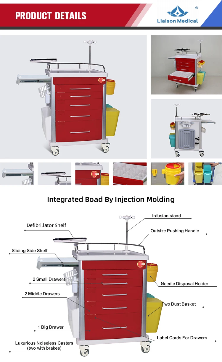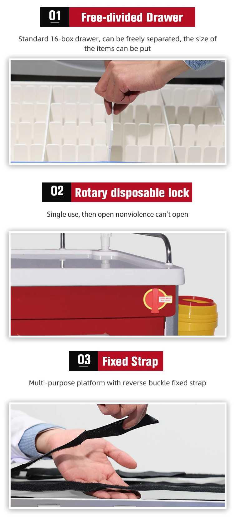 with hidden height adjustable IV pole , 2L sharps box in basket, 2 dustbins in 2 colors.