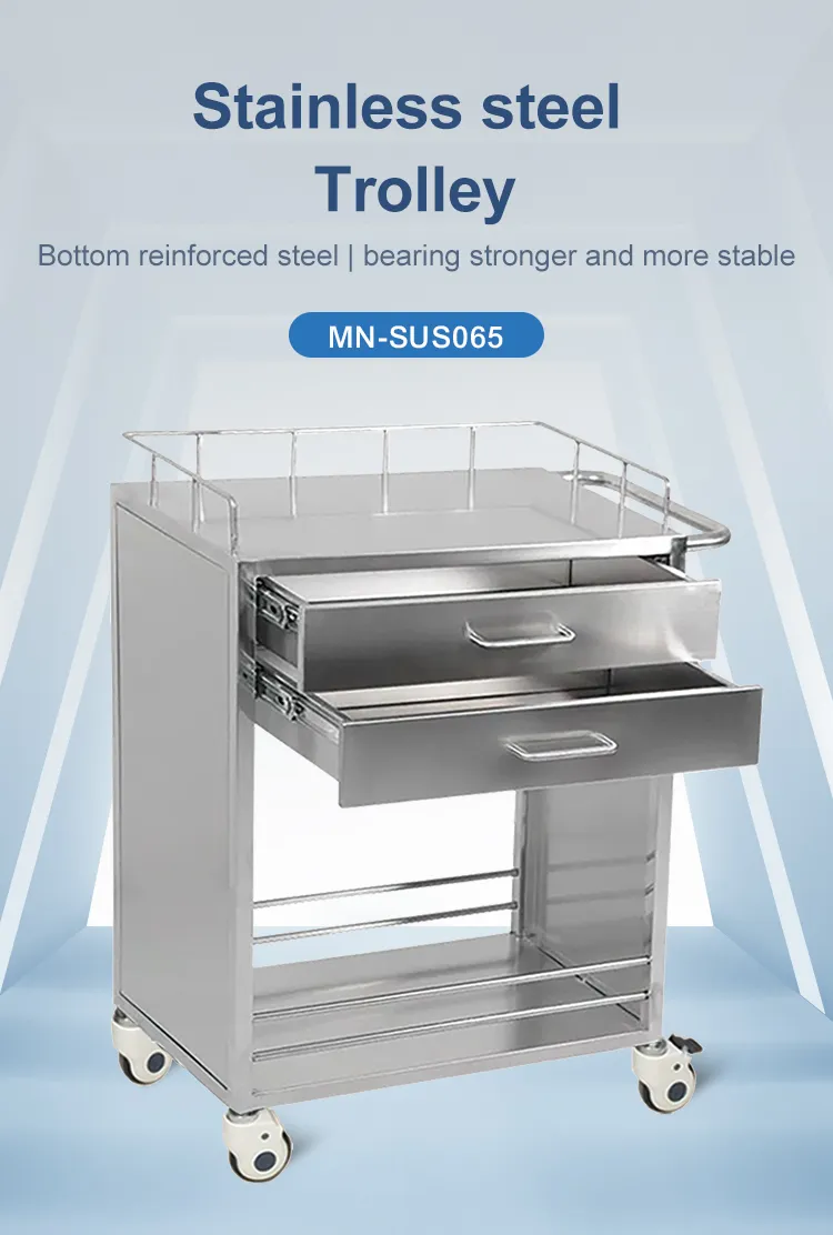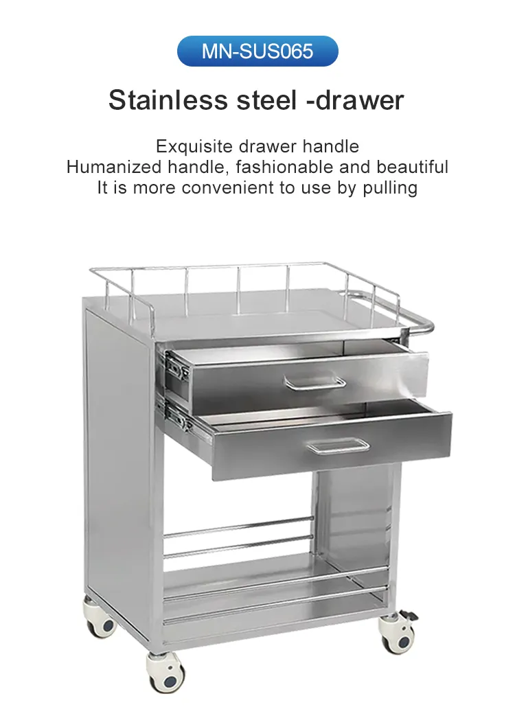 MN-SUS065 Hospital stainless steel medical equipment trolley with two drawers, nursing stainless steel trolley