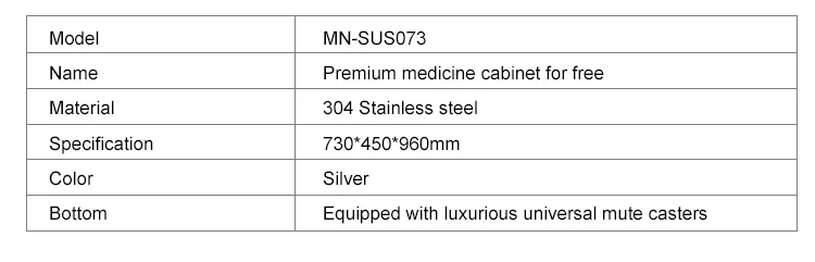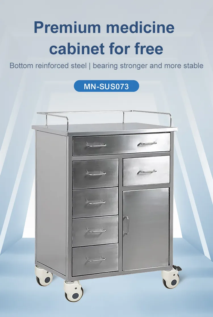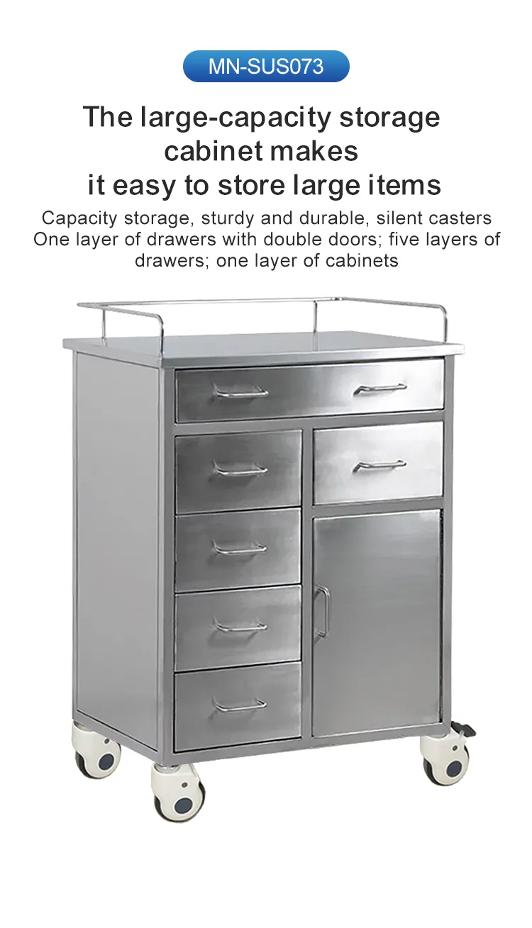 MN-SUS073 Stainless steel medical trolley with multi-drawer cabinet doors, a great assistant for storage in medical scenarios